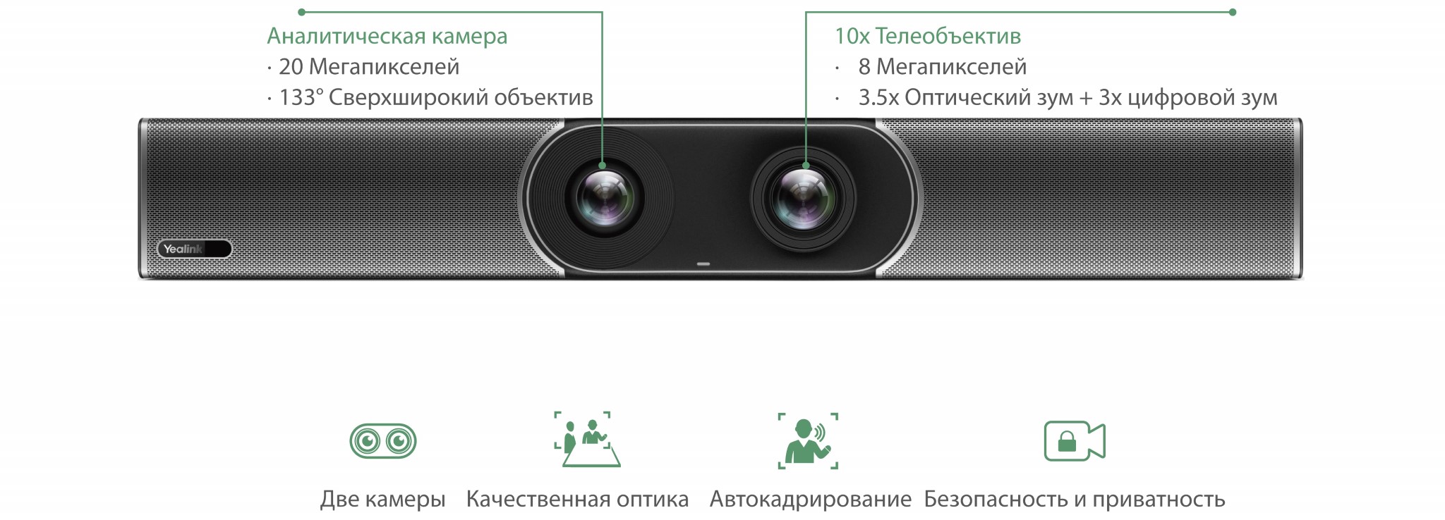 Yealink MeetingEye 600 — это умный многофункциональный видеобар “All-in-One” для средних и больших переговорных комнат. У видеотерминала две камеры. Одна — аналитическая со сверхшироким объективом и разрешением 20 мегапикселей, вторая — телеобъектив с 10-кратным гибридным приближением и разрешением 8 Мегапикселей. Благодаря этим камерам Yealink MeetingEye 600 подходит как для больших переговорных комнат, где требуется оптический зум, так и для ситуаций, когда требуется очень широкий угол обзора. Камеры Ultra-HD 4K и технологии искусственного интеллекта (распознавание лиц, определение местоположения источника звука, отслеживание говорящего и т. д.), а также автоматическая крышка объектива сделают ваши видеоконференции безопасными и удобными.