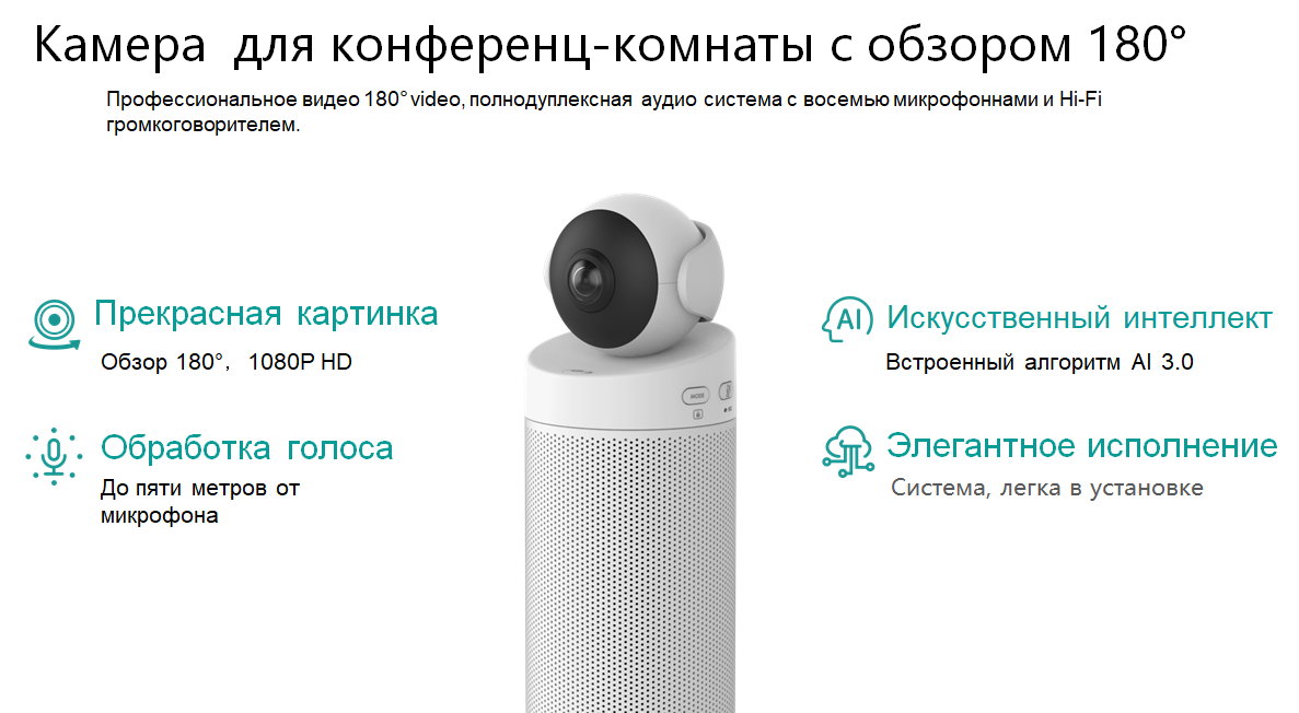 В элегантном белом корпусе - профессиональное видео 180° с разрешением 1080P HD, полнодуплексная аудио система с восемью микрофонами и Hi-Fi громкоговорителем.